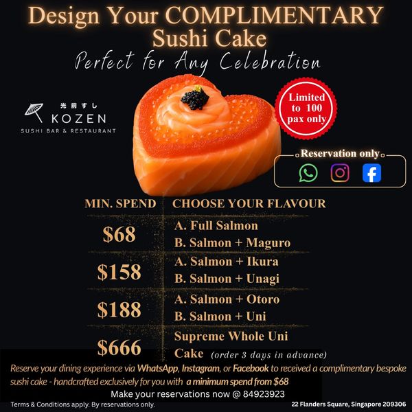 ✨ COMPLIMENTARY Customised Sushi Cake ✨ With minimum spending from $68 — Choose your ingredients, colours, and style. Reserve via WhatsApp / IG / Facebook only.
