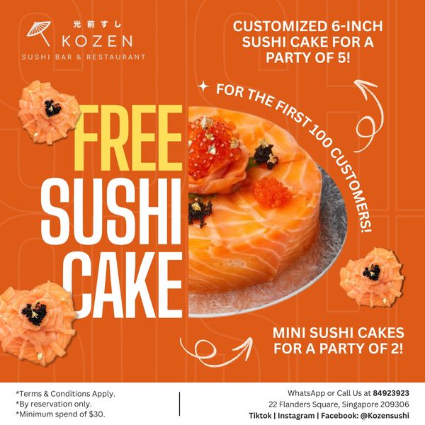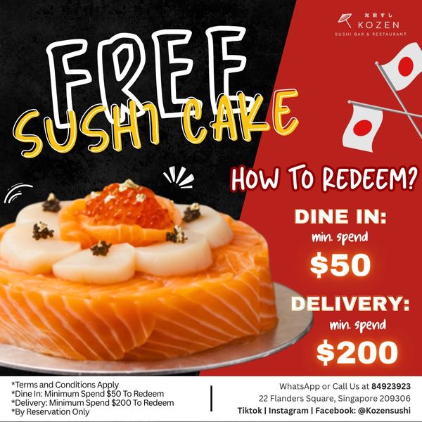 ✨ FREE Sushi Cake ✨ With minimum spending from $50. Reserve via WhatsApp / IG / Facebook only.